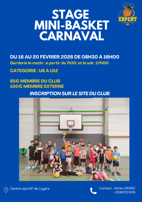 Le club organise son traditionnel stage de Carnaval du 16/02/26 au 20/02/2026 pour nos catégories U8 à U12 ! 🏀